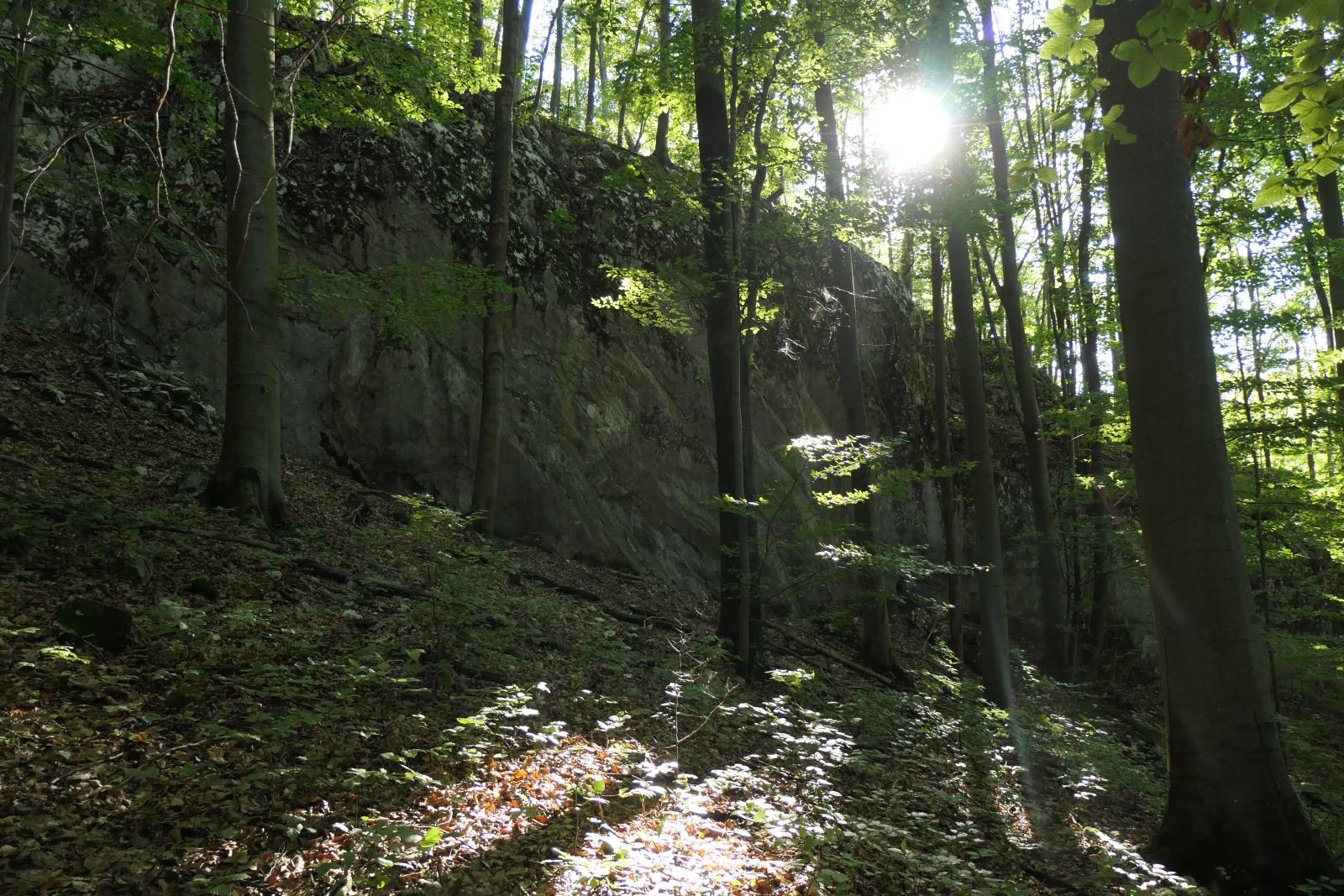 Po cca 250 m sa cesta opäť rozdvojuje, opustíme modrú značku a prudkým výšľapom (alebo aj kúsok potlačíme), sa dostaneme nahor k okraju lúky. Tesne pred lúkou je na pravej strane tabuľka VKA – tu odparkujeme bicykel a po extrémne strmej cestičke (kto chce, môže skúsiť, ale nedávame tomu šancu, keďže pod lístím je vrstva prírodného vápencového štrku) vystúpame asi 50 m. Keď sa terén trochu vyrovná a sme na úrovni dvíhajúcej sa skaly naľavo od chodníka, odbočíme popod skalu doľava. O chvíľku je tu jaskynka a za ohybom skaly aj pamätná tabuľa vo výške cca. 3,5 m.